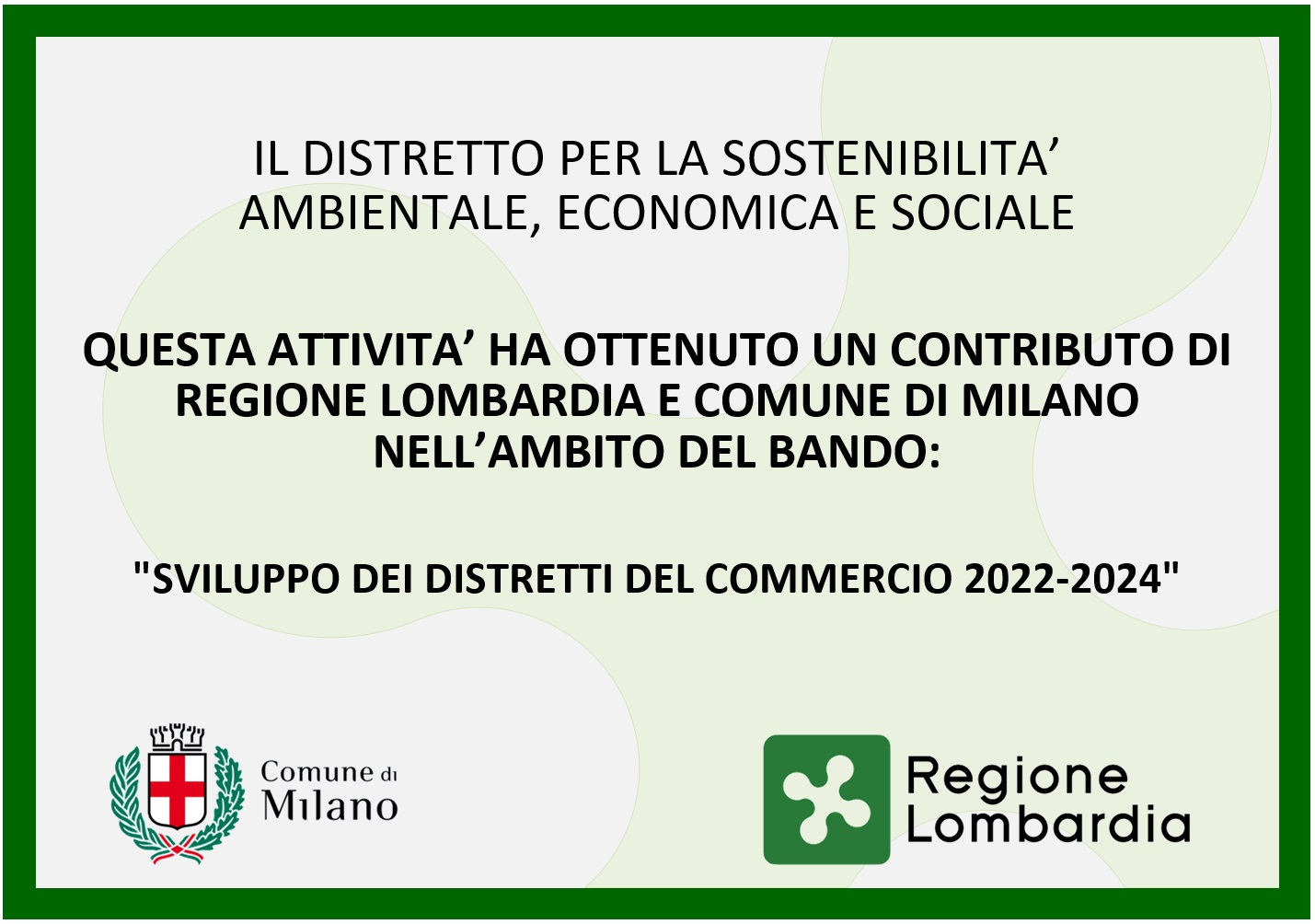 Il Comune di Milano e Regione Lombardia, nell’ambito del progetto “Sviluppo dei Distretti del Commercio 2022 -2024”, con il presente avviso intendono sostenere le attività economiche dei servizi ai consumatori e ai cittadini, nonché l’avvio di nuove attività ubicate all’interno degli ambiti territoriali delle 9 polarità distrettuali del Distretto Urbano del Commercio di Milano: Brera, Buenos Aires, Galleria, Giambellino, Isola, Navigli, Sarpi, Ticinese, XXV Aprile.